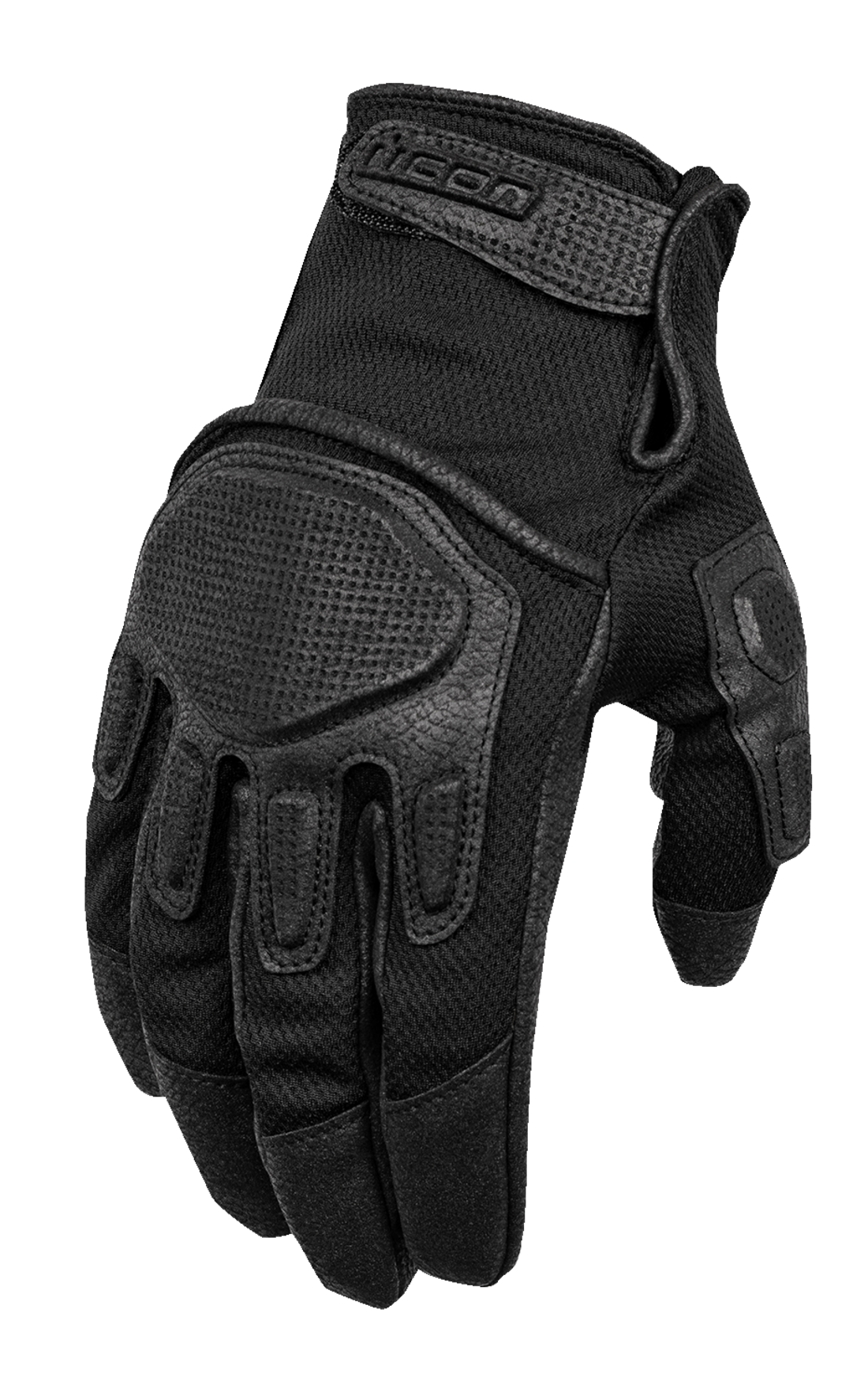 Мото ръкавици ICON Punchup Black Основата е изработена от еластичен полиестерен текстил с наслагвания Ax® Laredo Задната част на ръката е с плаващ дизайн на кокалчетата с вграден елемент D30® Протектори за удар на кокалчетата, пръстите и китката D3O®