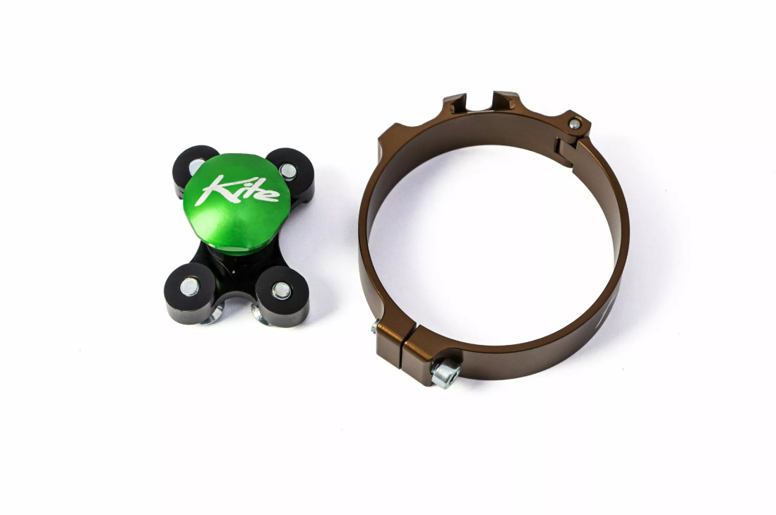 Holeshot система KITE LAUNCH CONTROL D59 Green Изработен от самолетна алуминиева сплав Може да се монтира без да се сваля вилката от тройните скоби Три различни диаметъра (54, 57, 59 мм) за перфектно прилягане Пръстен анодизиран във фабричен бронзов цвят, копчето се предлага в оранжево, червено, синьо и зелено Четири контактни точки за трайно фиксиране