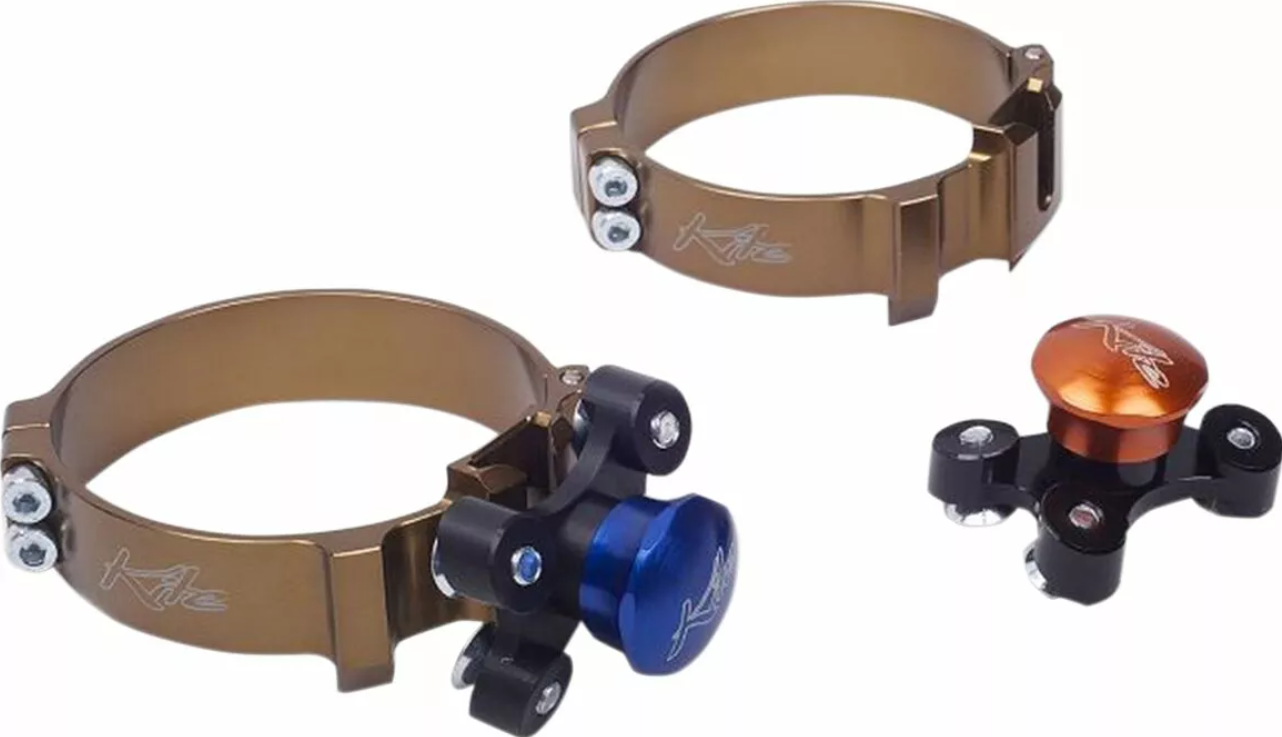 Holeshot система KITE LAUNCH CONTROL HUSQ/KTM Blue Изработен от самолетна алуминиева сплав Може да се монтира без да се сваля вилката от тройните скоби Три различни диаметъра (54, 57, 59 мм) за перфектно прилягане Пръстен анодизиран във фабричен бронзов цвят, копчето се предлага в оранжево, червено, синьо и зелено Четири контактни точки за трайно фиксиране